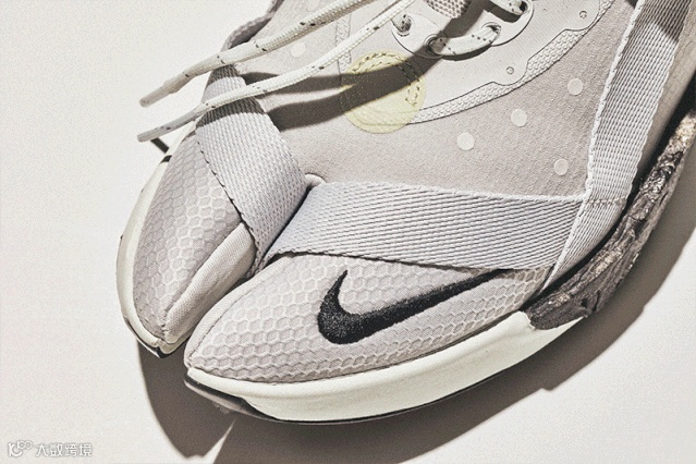 最主要视觉亮点在鞋头,这款采用了 Tabi 分趾的设计。说起来,NIKE 早在 1996 年就推出了分趾鞋 Air Rift,设计灵感来自肯尼亚的赤足跑者。