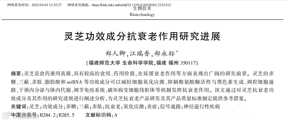 [1]郑人卿,江瑞香,郑永标.灵芝功效成分抗衰老作用研究进展[J/OL].生物技术,1-8[2025-04-11].http://kns.cnki.net/kcms/detail/23.1319.Q.20250301.2125.012.html.