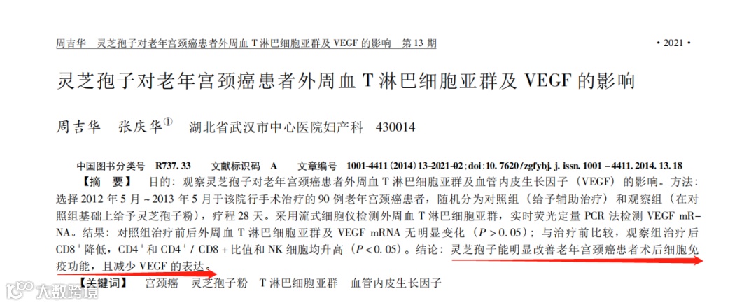 [3]周吉华 张庆华,灵芝孢子对老年宫颈癌患者外周血 T 淋巴细胞亚群及 VEGF 的影响[J],湖北省武汉市中心医院妇产科 430014.