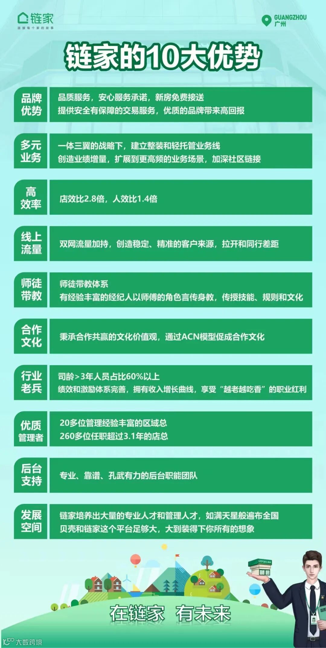 链家,成立于 2001 年,是以数据驱动的全价值链房产服务平台。提供二手房、新房、租房、旅居房产、海外房产等房产交易服务,并拥有业内独有的房屋数据、人群数据、交易数据,以数据技术驱动服务品质及行业效率的提升。经过 18 年的发展,链家目前已进驻北京、上海、广州、深圳等 29 个城市和地区,全国直营门店数量超 7000+家,旗下经纪人约10+ 万人。链家2018 年推出贝壳找房平台,通过平台规范房地产中介市场,致力于推动行业进步和经纪人的职业化。贝壳找房平台于 2020 年 8 月 13 日赴美上市,成为国内居住服务平台第一股。同时在两年后的2022年5月11日于香港港交所上市,成为首家双重上市的中概股“一冀两翼”将会更好服务广大消费者。