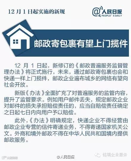 ①未来邮政寄包裹有望和快递一样上门揽件;②索道、宾馆等将不能出现在国家级风景名胜区的核心景区内;③新版《中国药典》实施,买药将可更放心;④北京:居民婚姻登记可跨区办理;⑤四川:高速路过路费将与服务质量挂钩…与你的权利息息相关↓↓转发提醒!