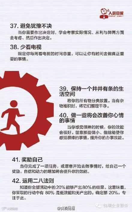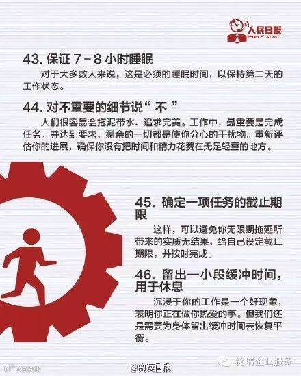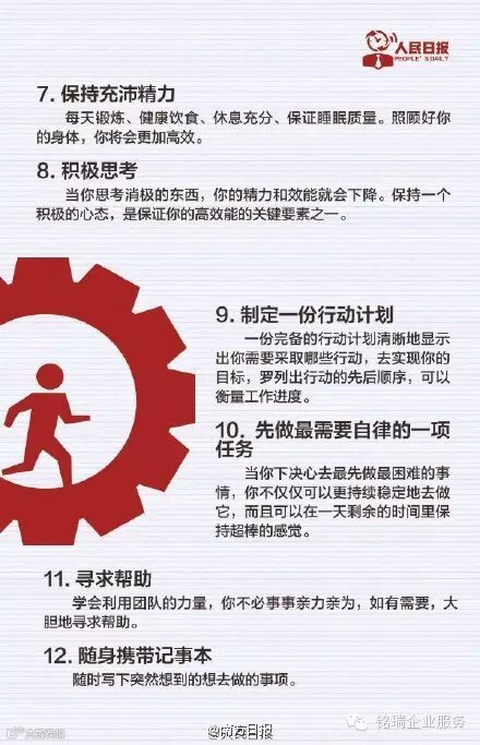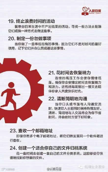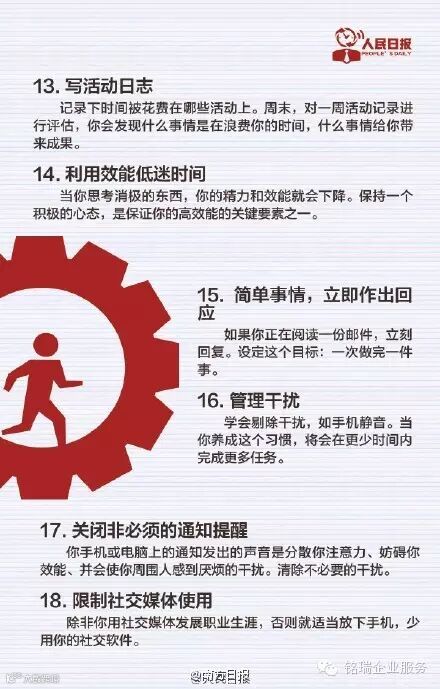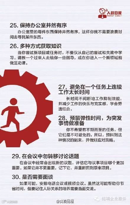广州诚丰信企业服务有限公司2015年,只剩下2个月。50个方法,助你管理时间,过好每一天!①高效:效能最高的时间段,做最重要的任务②制作清单:把要做的每件事都列出来,进行目标切割③20:80定律:80%时间用来做20%最重要的事情④管理干扰:学会剔除干扰…11月第一个星期一,加油!