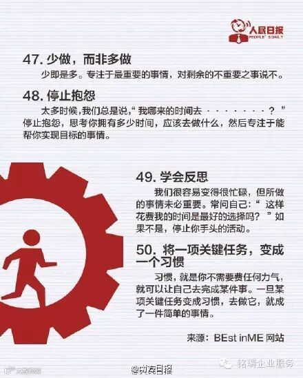 2015年,只剩下2个月。50个方法,助你管理时间,过好每一天!①高效:效能最高的时间段,做最重要的任务②制作清单:把要做的每件事都列出来,进行目标切割③20:80定律:80%时间用来做20%最重要的事情④管理干扰:学会剔除干扰…11月第一个星期一,加油!