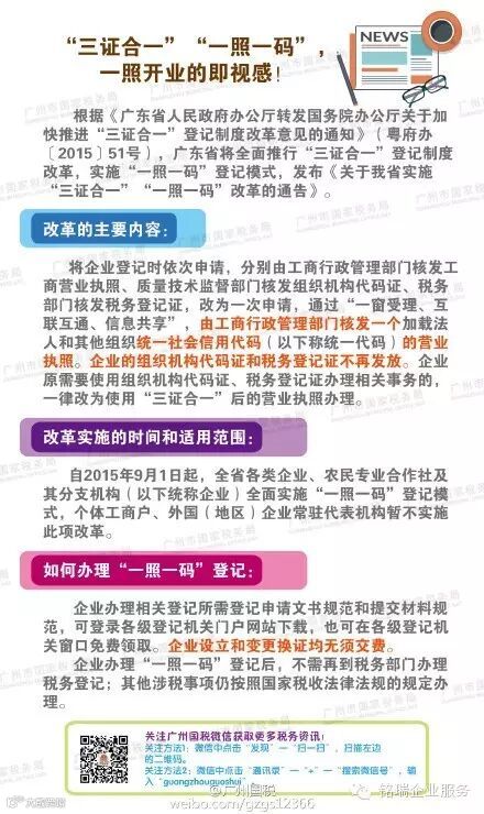 根据粤府办〔2015〕51号,我省将全面推行“三证合一”登记制度改革,实施“一照一码”登记模式。将企业登记时依次申请的工商营业执照、组织机构代码证和税务登记证改为一次申请,由工商部门核发一个统一社会信用代码的营业执照。