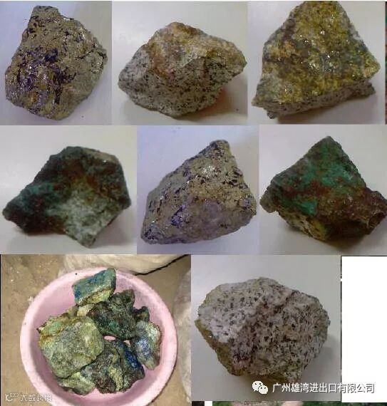 矿石种类涵盖铜矿、锑矿、铅锌矿、镍矿、锰矿、钴矿、铬矿、钼矿、钨矿、钛矿、铋矿、镁矿、铝土矿、锡矿、磷矿、重晶石、大理石、长石、半宝石、、孔雀石、白云石等矿石。