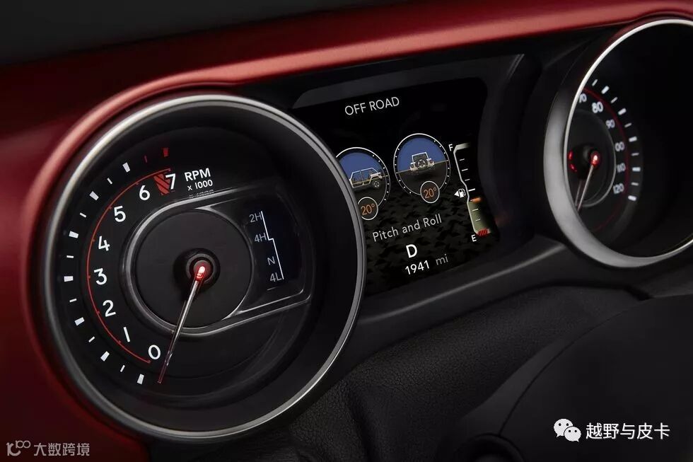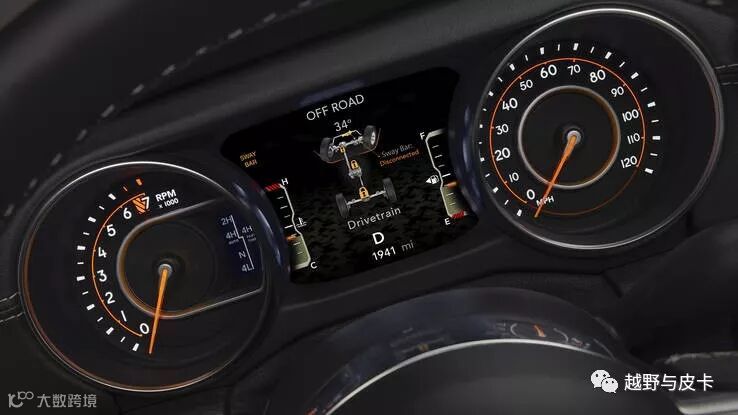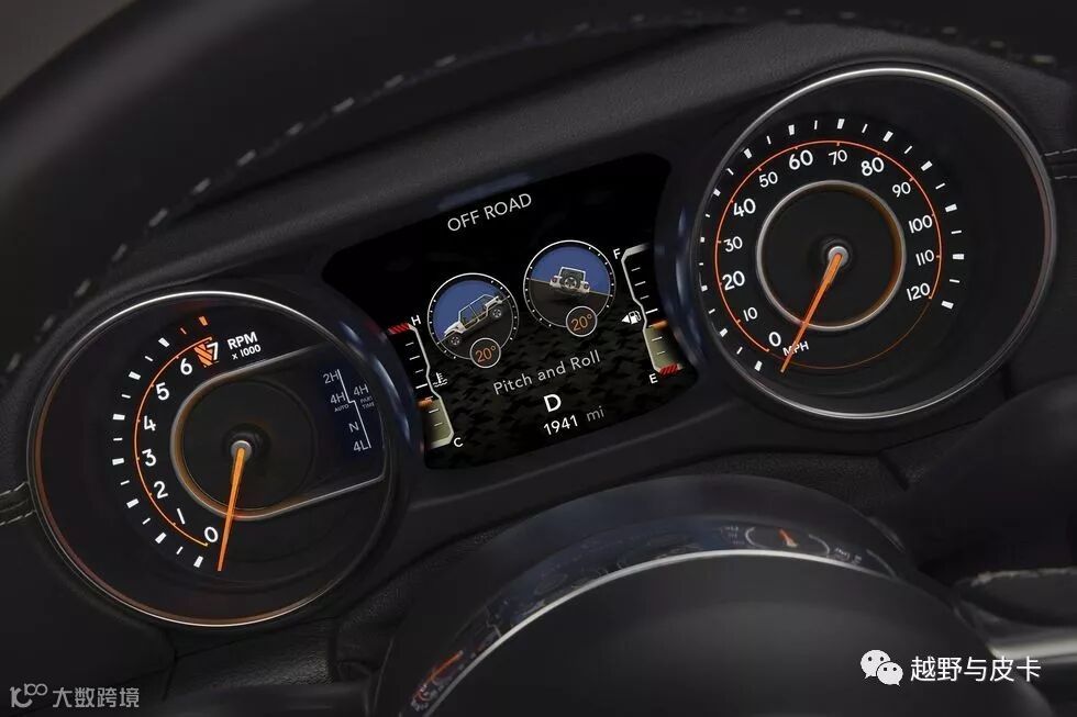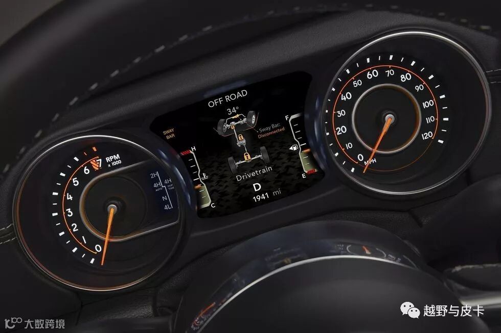 仪表盘中间的屏幕有专门的越野界面,可以显示车辆侧倾角度,前轮转向角度,四驱状态跟差速锁状态