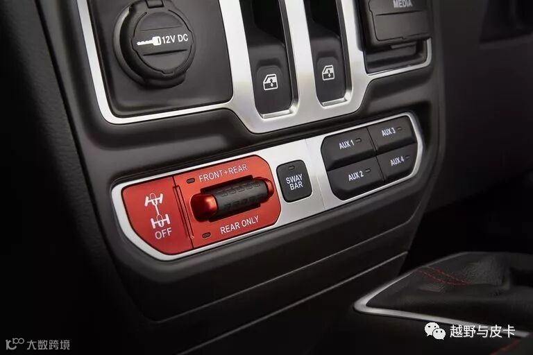 卢比肯采用Rock-TracNV241分动箱,低速扭矩放大4倍,前后桥均使用Dana44车桥,前后电控差速锁,并且设计了单独的解锁按钮,前可断开防倾杆得以保留,在极限情况下断开防倾杆可进一步加大前悬挂行程。