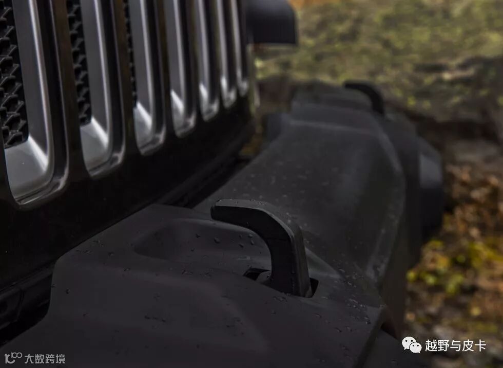 卢比肯装备了钢制前后杠,前杠上带有两个拖钩,要知道现款JK前杠上可是没有一个拖车钩的!前杠可拆卸的包角可以进一步提升接近角,并且原厂就配备了绞盘安装位,也就是说不需要更换前杠就可以在JL前杠上装备绞盘!
