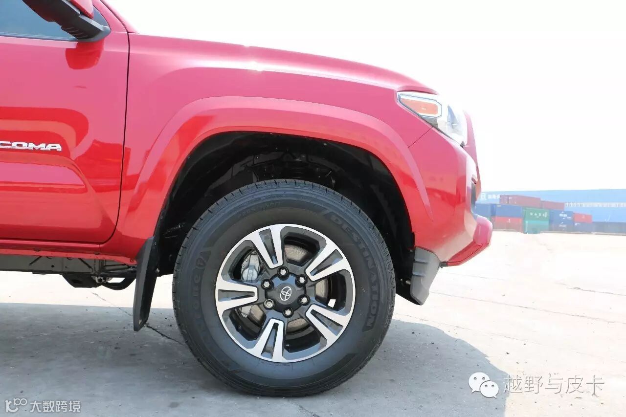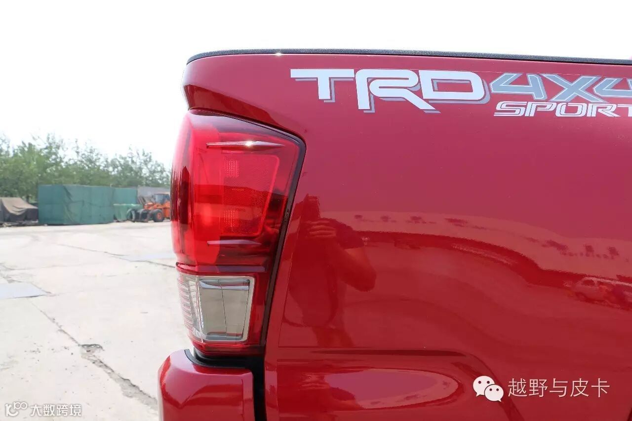 这次邂逅,终于见到了第三代Tacoma。我们看到的Tacoma为双排短货箱手动版TRD sport,相比offroad版本的硬派,sport版本则要更加精致实用,17寸轮圈,车身同色的外观装饰件,以及降低风阻的外观套件。