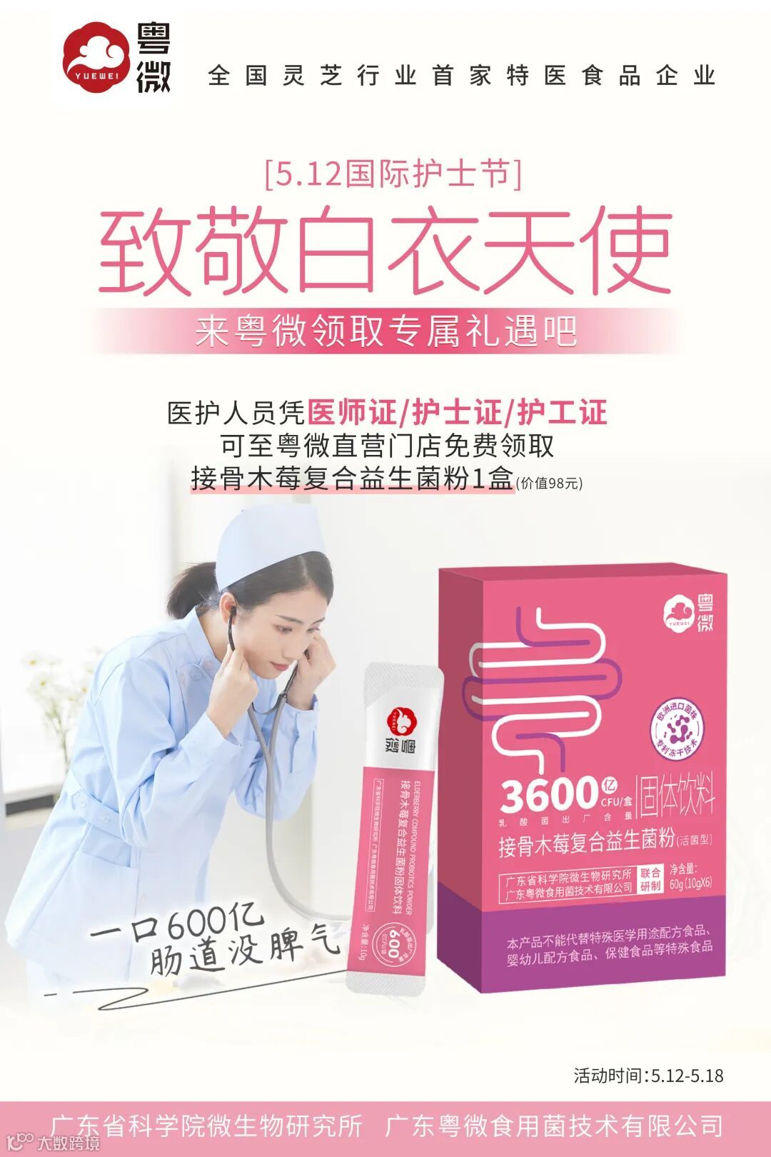 5月12日 - 5月18日期间,医护人员凭医师证、护士证或护工证,可至粤微直营门店免费领取价值98元的接骨木莓复合益生菌粉1盒。