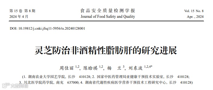 [2]周佳丽,陈晗琪,杨兰,等.灵芝防治非酒精性脂肪肝的研究进展[J].食品安全质量检测学报,2024,15(08):41-49.DOI:10.19812/j.cnki.jfsq11-5956/ts.20240128001.