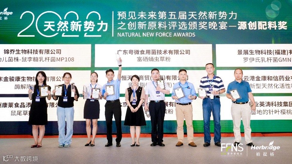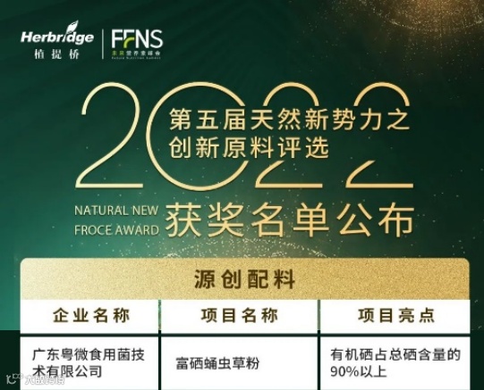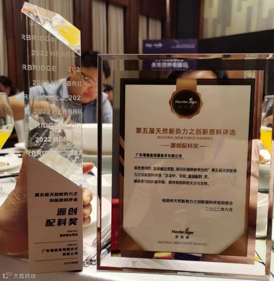 近日,2022年“第五届天然新势力之创新原料评选”在海南海口成功举办。本次评选旨在挖掘出在原料、技术、应用方面的创新潜力,为整个行业赋能的天然健康产业企业,粤微专利技术产品“富硒蛹虫草粉”经过海选、评审等多轮缜密评选,在136 个参评项目中脱颖而出,荣获“源创配料奖”。这份荣誉,对粤微科研团队刻苦攻关、勇于创新的精神给予了肯定,也再次彰显出粤微在食药用菌领域雄厚的科研技术底蕴。
