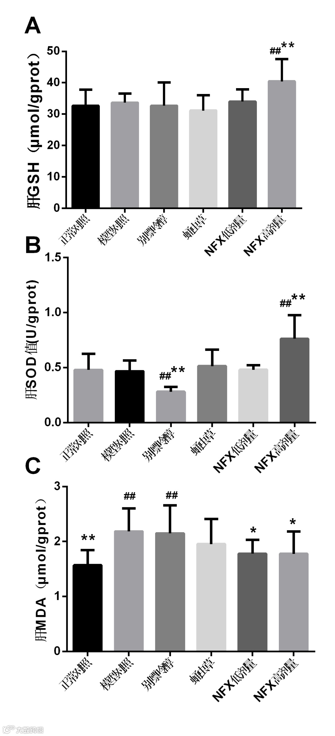 A 肝脏GSH;B肝脏SOD;C 肝脏MDA。#与正常对照组相比差异显著,##与正常对照组相比差异极显著;*与模型对照组相比差异显著,**与模型对照组相比差异极显著。