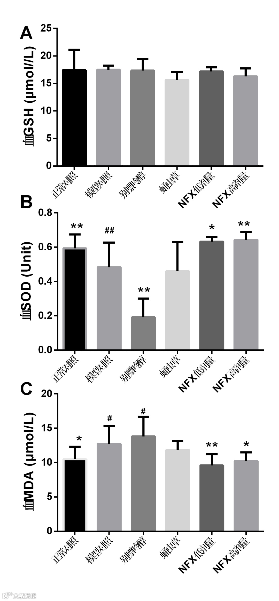 A 血清GSH;B血清SOD;C 血清MDA。#与正常对照组相比差异显著,##与正常对照组相比差异极显著;*与模型对照组相比差异显著,**与模型对照组相比差异极显著。