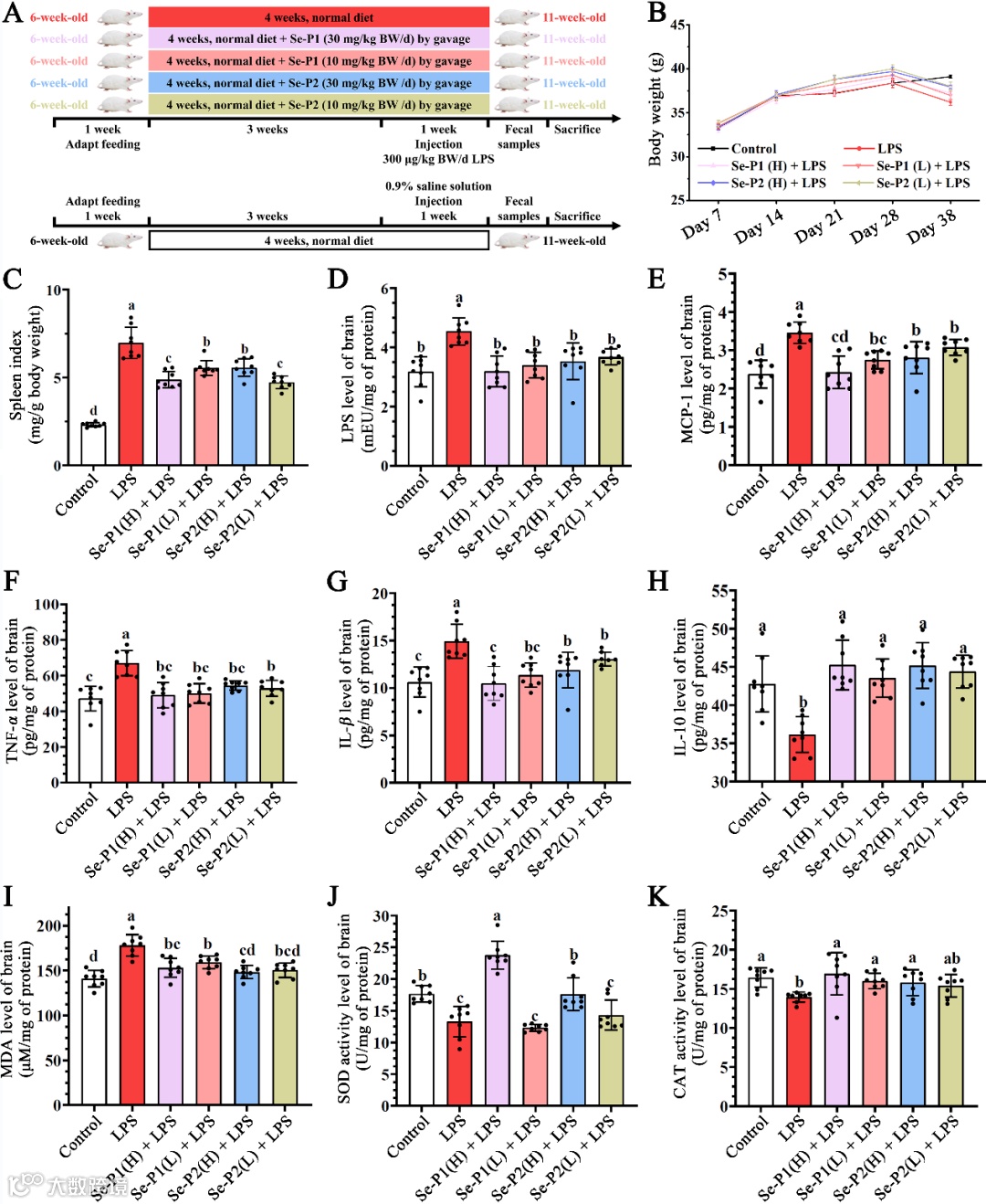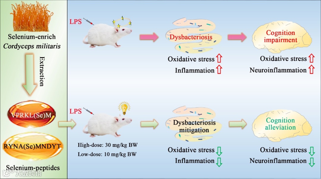 粤微与暨南大学、广东省科学院微生物研究所联合开展富硒蛹虫草新型硒多肽对神经炎症小鼠模型靶向肠道菌群干预大脑健康的“菌群-肠-脑”的作用机制研究。结果显示,从富硒蛹虫草中分离得到的硒多肽VPRKL(Se)M(Se-P1)和RYNA(Se)MNDYT(Se-P2) 具有神经保护作用,可减轻LPS诱导的神经炎症和认知功能障碍,缓解LPS诱导的肠道炎症和肠道菌群失调。
