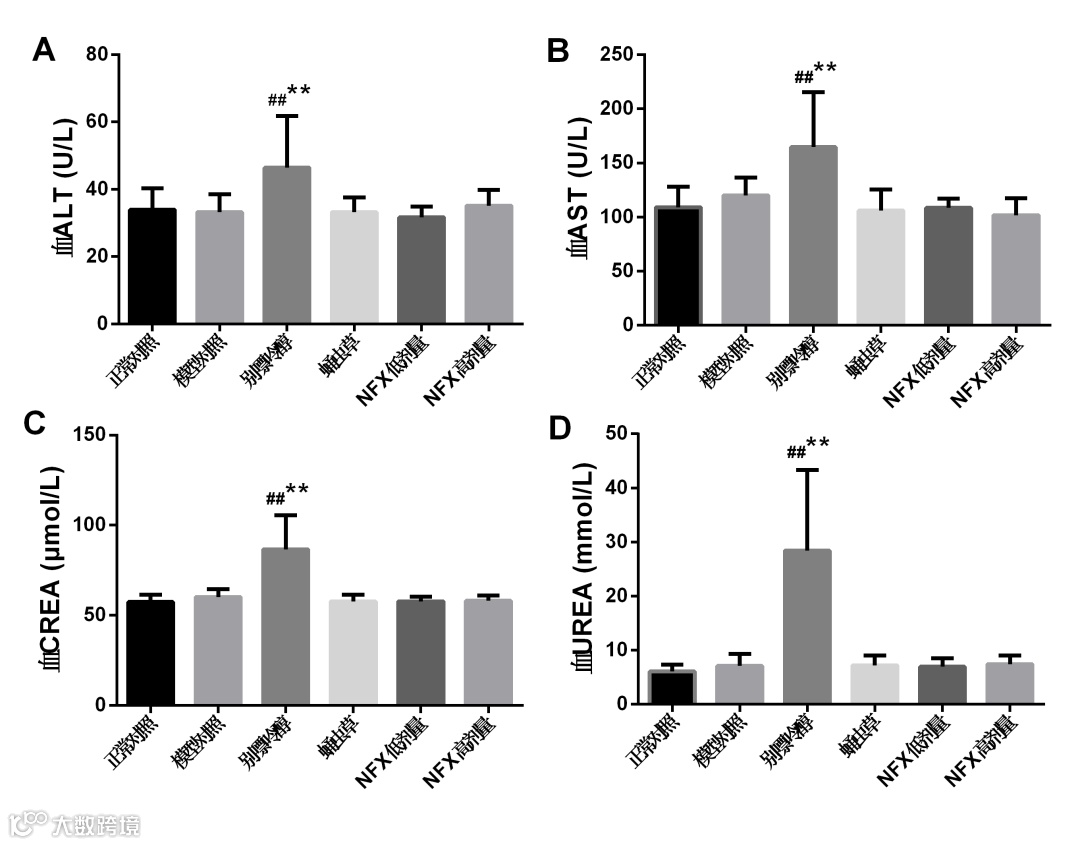A 血清ALT;B血清AST;C 血清CREA;D 血清UREA。#与正常对照组相比差异显著,##与正常对照组相比差异极显著;*与模型对照组相比差异显著,**与模型对照组相比差异极显著。