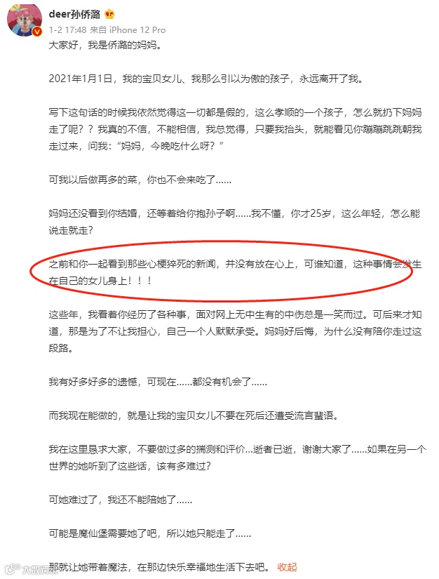 1月2号下午,《巴啦啦小魔仙》凌美琪扮演者孙侨潞的母亲在微博上证实了女儿的死讯。