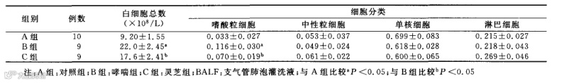 实验结果同时也表明,灵芝组BALF中细胞总数、嗜酸粒细胞百分比均比哮喘组低。