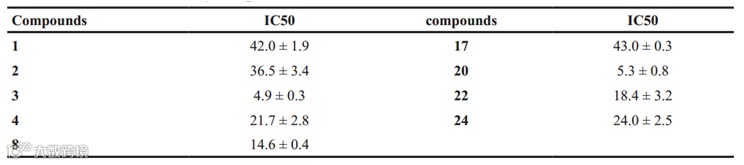 图3 化合物3和化合物20对乳腺癌细胞MDA-MB-231表现出明显很强的杀死效果(来自(Chen et al.,2016))