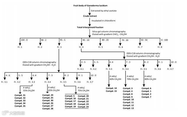 作者首先从灵芝子实体开始,经乙酸乙酯提取,硅胶柱色谱分离,反向色谱柱分离和高效液相色谱分离得到35种灵芝三萜,其中包括5种是未见报道的三萜醇新化合物。