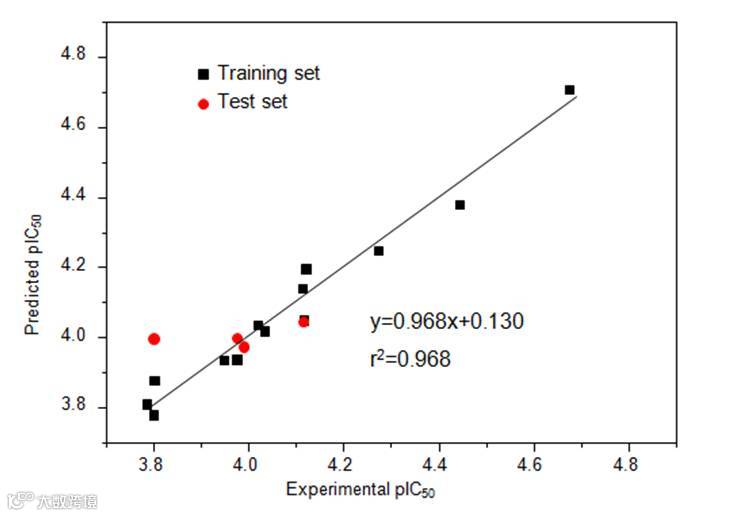 紧接着作者使用三维定量构效(3D-QSAR)预测灵芝三萜化合物对乳腺癌细胞MDA-MB-231效果。结果显示预测的IC50值和实验测得的IC50值一致性显著。