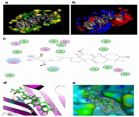 作者进一步探索了化合物3构效关系,通过3D-QSAR建模对接分析可以看到化合物3可能通过与肿瘤坏死因子TNF-α形成氢键,作用靶点达到抑制癌细胞作用。a和b为模拟化合物3范德华力网结构和电子势能结构网,c为化合物3与肿瘤坏死因子TNF-α相互之间作用对接二维结构图,d、e为化合物3与肿瘤坏死因子TNF-α对接三维结构图。