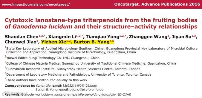 12月28日广东省微生物研究所食用菌研究与发展中心,广东粤微食用菌有限公司,和加拿大多伦多大学的Sunnybrook研究所Burton B Yang教授团队合作在美国著名肿瘤杂志《Oncotarget》上发表了一项灵芝的重要研究成果。