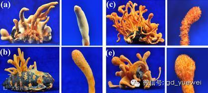 经过交配并含有完整一套交配生殖基因的蛹虫草,自然形成顶部隆起,隆起部分着生子囊壳(表面的小疙瘩),子实体整体呈狼牙棒形或杵形。另外,目前尚未有研究指出有隆起和没有隆起的蛹虫草,是否存在有效成分或者功效方面的差异,至少在虫草素和蛹虫草子实体外观之间关系的研究中并未发现二者存在必然联系。但可以肯定的是,不同菌株、不同产地、不同栽培料生产出的蛹虫草存在有效成分差异。图3中(a)和(b)都是交配生殖基因不完整的品种,可见子实体形成较少、子实体顶部无明显隆起、表面光滑无子囊壳产生;而(c)和(e)则是把(a)和(b)的菌丝体分别按不同比例杂交而生,使控制交配生殖的基因得到不同程度的恢复,可见杂交后产生子实体多而粗壮、顶部隆起、表面产生小疙瘩状的子囊壳。