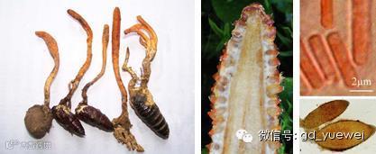 图1 蛹虫草野生状态(左图);半包埋在子实体顶端表面的子囊壳(中图);显微镜下蛹虫草的子囊孢子(右上)和子囊壳(右下)。