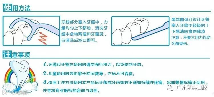 第三,学会巧用牙线,将嵌在牙缝里(相邻两颗牙齿之间的缝隙)的污垢清除干净。牙线的使用方法是:取一段15~20厘米长的牙线,将牙线两端分别缠绕在两手的食指或拇指上,然后拉直牙线,让其慢慢进入相邻两颗牙齿之间的缝隙内,然后将牙线贴着牙齿的邻面轻轻地上下刮动或里外拉动,从而清洁牙缝里的牙菌斑、食物残渣等。每清洁一段时间,要用清水漱口,漱净被刮下的菌斑,再继续清洁。