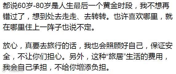 早些年,我给自己存了一点钱,是用来养老的。当时,就是想着靠自己养老,以后不给你增添负担。现在,这个想法也算是实现了一部分。我会好好规划晚年生活,照顾好自己的,请你放心。