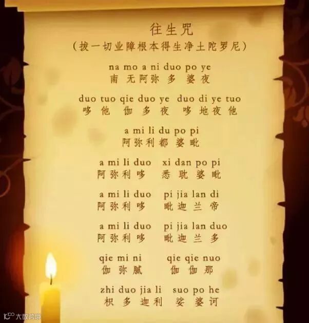 佛经云:持诵往生咒者,可迅速超度亡灵,化解冤结,净除业障!并得“阿弥陀佛常住其顶日夜拥护。”加持你不受疾病、灾厄、苦难、鬼邪的侵扰!