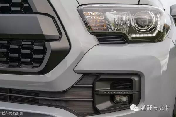这款车的雾灯也经过了升级,采用了Rigid Industries的LED产品。这款雾灯拥有两个功能,其中一个就是传统的雾灯功能呢;而另外一个则是较大流明的灯光,并且角度更加靠前,可以照亮车前15x20米的区域,从而为驾驶者提供更好的照明。消费者也完全不必担心法规的问题,这套Rigid Industries出品的雾灯完全满足法规上路标准。