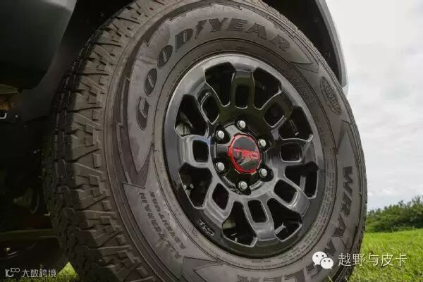TRD Pro车型装备了一套特别款式的轮圈,16x8规格的TRD轮圈搭配了固特异品牌的 265/70R16规格Wrangler All-Terrain Adventure轮圈。