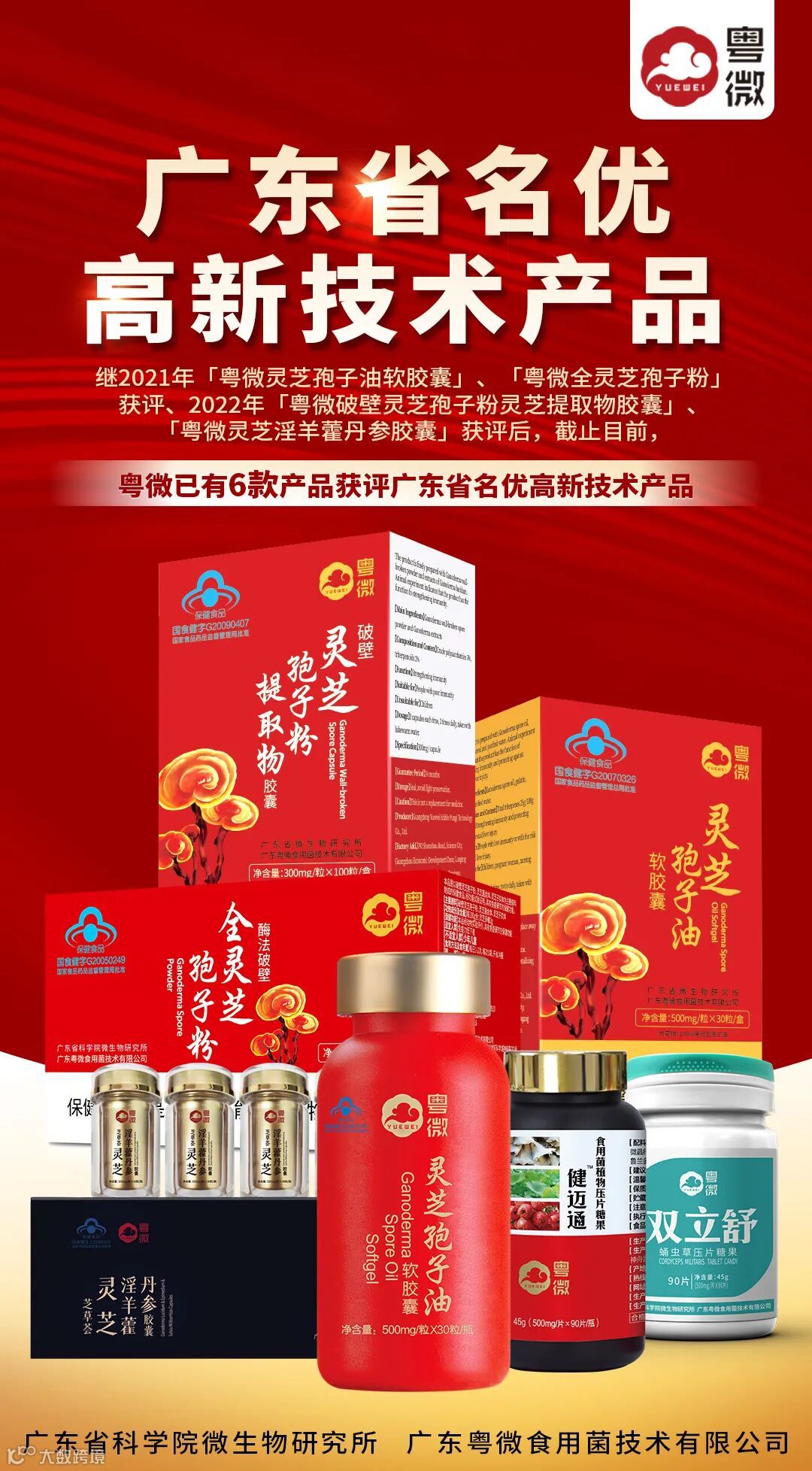 粤微灵芝孢子油软胶囊,系粤微和广东省科学院微生物研究所共同承担的重大科技专项“灵芝有效成分的提取及抗肿瘤研究”成果转化应用而来,采用了内源酶破壁核心专利技术及小分子滤截留技术结合超临界CO2萃取浓缩工艺,该技术达到国际领先水平,还曾被评为广东省自主创新产品。