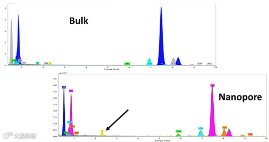 图2所示就是基底(bulk)和纳米孔洞(nanopore)两个区域对应的谱图信息。图中不同的颜色代表不同元素的谱峰,通过解卷积的算法和颜色的加持可以帮助用户判断谱峰拟合的完美程度。由对比可以清楚地发现,S元素在纳米孔洞区域出现富集。