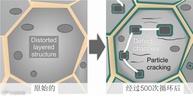 作者还采用了其他手段对样品进行了分析和表征,结果表明,纳米孔洞的出现,强烈影响了电池的性能,这主要由于纳米孔洞的形成造成了O的损失,进而形成了”岩盐区“,并且引起应力的形成最终在电池内部形成微裂纹,导致了整体电池性能的下降,其机理讨论示意图如图4所示。