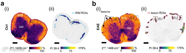 图5.激光红外成像引导 TIMS-MSI 分析实验性自身免疫性脑脊髓炎(EAE)的小鼠脊髓白质中的脂质重塑。a、b (i) 健康对照组的(Ctrl, a)和实验性自身免疫性脑脊髓炎 (EAE, b) 1466 cm−1的小鼠脊髓激光红外图像(二阶导数),脊髓白质中的包含(α -无病变)和(β1),(β2 -有病变)。比例尺,300 μm。a, b (ii)激光红外成像引导PI 38:4 [M-H]-的质谱成像。相比之下,对照组脊髓(a)的白质比实验性自身免疫性脑脊髓炎(b)的白质区域更小。d 激光红外成像引导离子成像I m/z 616.472 (CerP 34:1;O2[M-H]-) II m/z 687.545 (CerPE 36:1; O2 [M-H]-),和m / z 885.549 (PI 38:4 [M-H]-), 如(a, b)中含有(α),(β1)和(β2)。激光红外图像和H&E显微照片供参考。比例尺, 75 μm。