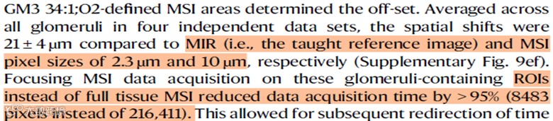利用酰胺I带和羰基振动之间1720 cm−1处的脂质红外特征峰 (一阶导数) 的差异可以区分肾小球结构和周围的肾皮质。从而可以将质谱成像的数据采集时间减少95% (从整片肾脏组织的216,411个像素点降低至8483个像素点)。随后可以将时间和精力重新聚焦到通过使用iprm-PASEF对锁定的肾小球中的10种神经节苷脂进行非常高置信度的鉴定。