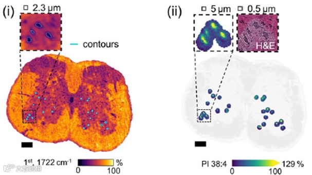 图4. (i) 实验性自身免疫性脑瘤小鼠脊髓(1722 cm−1; 一阶导数)与锁定的运动神经元细胞的激光红外图像(蓝线)(ii)激光红外成像引导离子图像m/z 885.549 (PI 38:4[M-H]-;质量窗口±10 ppm),突出显示神经元细胞。比例尺,200 μm。