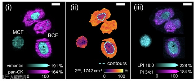 ((i)使用波形蛋白抗体 (m/z 1230.84; 成纤维细胞) 和全角蛋白抗体 (m/z 1288.71; 癌症) 抗体的多通道MALDI免疫组化质谱成像图 。质量窗口±10ppm。(ii)球体切片的红外成像图 (脂质特征峰1742 cm−1; 二阶导),MALDI免疫组化聚类分析 (k = 2) 得出成纤维细胞核心轮廓 (青色,虚线)。(iii)m/z 835.54 (PI 34:1 [M-H]-; 成纤维细胞) 和m/z 599.32 (lyso-PI 18:0 1 [M-H]-; 癌症) 质谱成像图。比例尺, 200 μm)