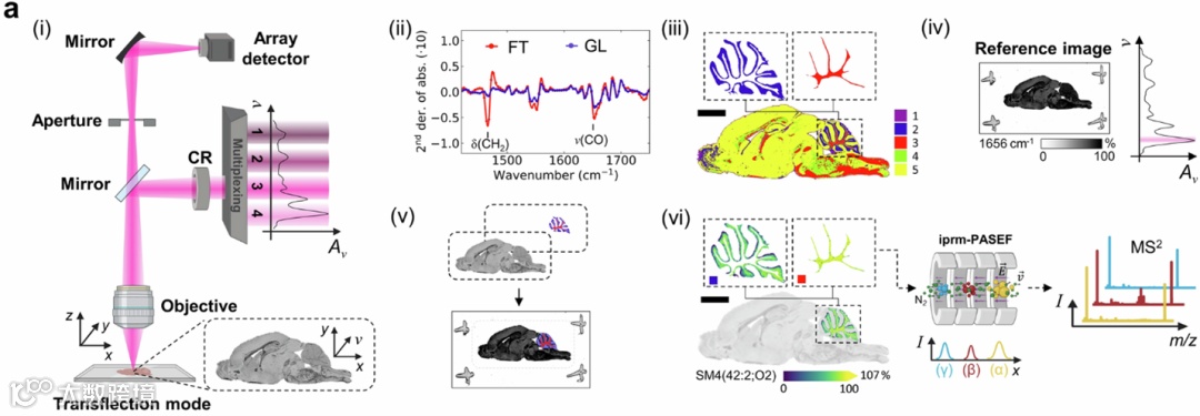 ((i)基于量子级联激光器的红外成像显微镜概述,以及激光红外成像引导质谱成像的具体流程。(ii)通过对光谱吸光度值进行二阶导运算,找出1466cm−1(CH₂弯曲振动)和1742cm−1(C=O振动)这两个特征峰来区分小脑纤维束(FT)和颗粒层(GL)。(iii)基于所选特征峰得到的分布图像和目标测试区域定义。(iv)基于单波数(1656cm-1)得到的参考图像。(v)基于所有高光谱数据集得到的图像与基于1656cm-1单波数得到的参考图像叠加显示。(vi)通过iprm-PASEF对锁定的小脑目标测试区域进行质谱成像。)