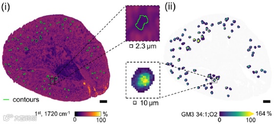 图3. (i) 通过ARSA−/−小鼠肾脏(1720 cm−1; 1阶导数)的激光红外成像图锁定的肾小球图像 (绿色轮廓线) 。(ii)激光红外成像图通过高亮的肾小球引导离子图像m/z 1151.71 (GM3 34:1;O2[M-H]-;质量窗口±10 ppm) 。比例尺, 300 μm。