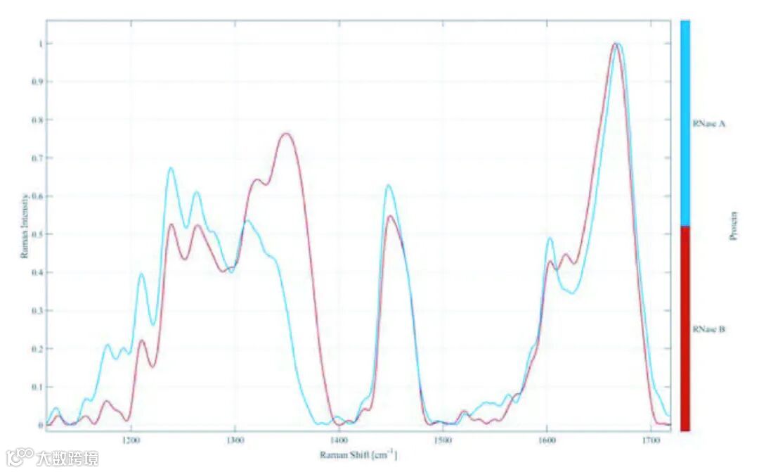 Hyperflux PRO Plus™连接探头测量在磷酸钠和氯化钠缓冲液中RNase A和RNase B拉曼光谱图在酰胺I和酰胺III区域有明显差异