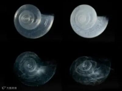 图2:在实验室环境下进行实验中,将翼足目动物的外壳放入2100年酸度水平的海水中,仅需45天便会溶解。