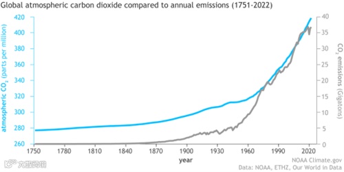 图3:自1750年工业革命开始以来,大气中的二氧化碳(蓝线)随着人类排放量(灰线)的增加而增加。到本世纪末,二氧化碳的排放量已增至每年350亿吨以上,并且仍在增加。
