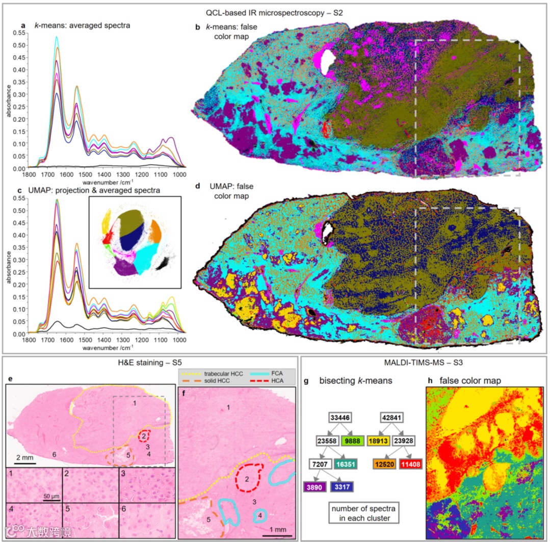 从下图可以看出,基于高信噪比的激光红外指纹光谱,通过UMAP算法,可以通过假彩图对多种成分做出细分,比如肝癌细胞、癌细胞间血管化的基质细胞、正常肝细胞、糖原沉积和固生肝癌组织等。相较于传统的H&E染色,能看到更深入的细节和肿瘤细胞的微环境,为肿瘤发生发展机制和肿瘤分型等方面的研究提供了新的手段的研究思路,有望将现有研究工作推到新的高度。