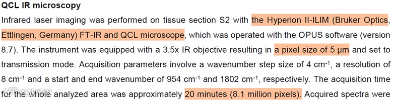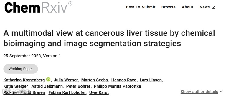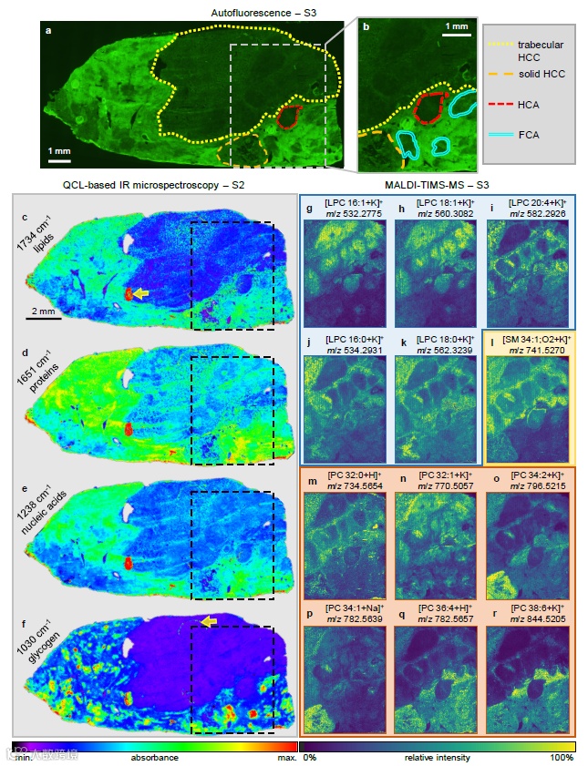 2023年9月25日,德国明斯特大学无机与分析化学研究所Uwe Karst教授团队在ChemRxiv上发表了题为A multimodal view at cancerous liver tissue by chemical bioimaging and image segmentation strategies的文章。在这项研究中,研究团队采用了布鲁克的激光面阵列红外成像光谱仪HYPERION II ILIM对患有肝癌的大鼠肝组织进行了超快速成像,该成像技术可以非标记、无损的快速完成整块切片组织的快速成像,同时还能达到5µm的亚细胞级空间分辨率,这一成像速度比同等空间分辨率下的质谱成像和µXRF成像快2~3个数量级。这项技术为肿瘤的快速诊断、疾病发生发展机制、预后评估和个性化治疗提供了全新的工具,更好地推动了空间组学技术的发展朝着更高分辨率、更快速度和更低成本的方向发展。