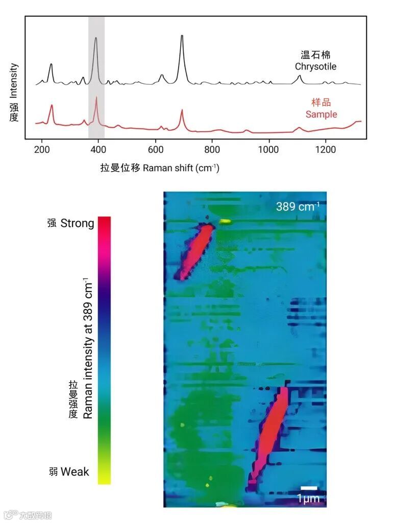 疑似石棉纤维的光谱和拉曼成像。样品光谱与温石棉(一种典型的石棉矿物)相符