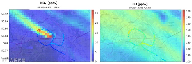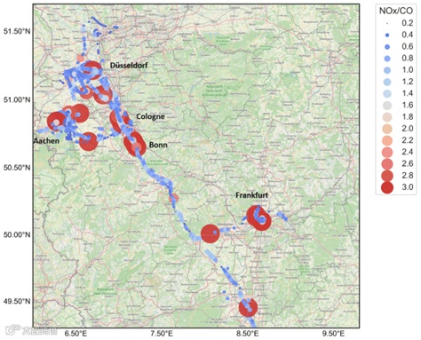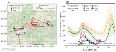 研究团队使用了一艘75米长的齐柏林飞艇,搭载Bruker MGA气体分析仪在2020年5月、6月和9月,共执行了24天、172架次飞行任务,覆盖法兰克福、科隆、波恩等城市以及多个工业区、高速公路。飞艇在飞行中缓慢升降,在200~450米高度范围内连续采样,尤其在起飞与降落阶段,获得了大量垂直剖面数据。